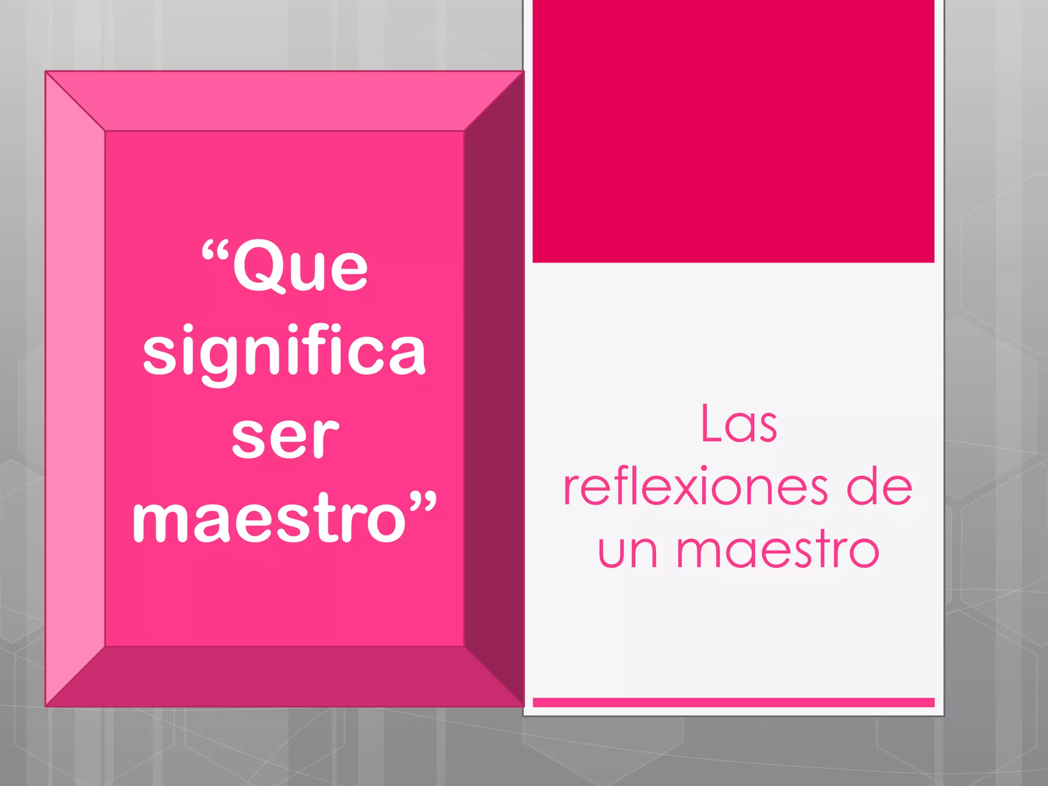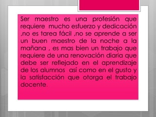 Ser maestro es una tarea de humanidad que requiere pasión hacia la enseñanza y se deleita al facilitar el aprendizaje en los alumnos utilizando buenas técnicas y estrategias. En México, ser maestro conlleva una gran responsabilidad y debe ser tomado como una respetable y admirable profesión.