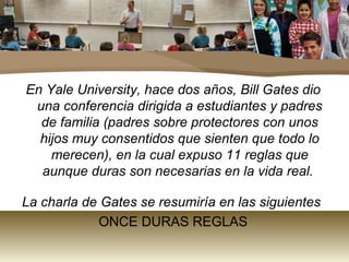 Bill Gates expuso 11 reglas duras pero necesarias en la vida real a estudiantes y padres en Yale. Las reglas incluyen: 1) La vida no es justa, 2) El mundo no se preocupa por tu autoestima sino por lo que logres, y 3) No esperes ganar mucho dinero rápido sino que te lo ganarás con esfuerzo.