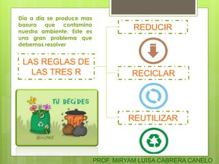 El documento describe las tres erres para reducir la basura: reducir, reutilizar y reciclar. Reducir se refiere a disminuir el consumo para producir menos basura. Reutilizar significa darle una segunda vida útil a los objetos. Reciclar consiste en obtener nuevos productos a partir de los materiales de desecho. El documento enfatiza la importancia de estas acciones para proteger el medio ambiente.