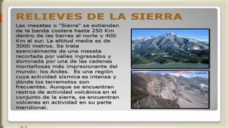 Ecuador es un país pequeño ubicado en el centro de la zona tórrida, con una gran variedad de paisajes naturales debido a la presencia de la cordillera de los Andes. Tiene gente amable y lugares de atracción, además de maravillas naturales. El relieve de Ecuador es variable principalmente por los Andes y su carácter volcánico, lo que crea diferentes climas y altitudes. La costa se extiende desde los Andes hasta el Pacífico e incluye relieves abruptos y llanos, mientras que la Amazonía descien
