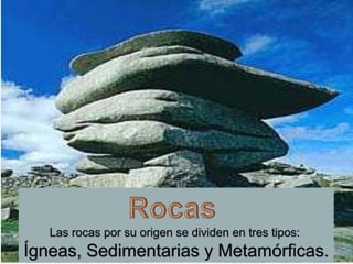 Este documento describe las características y clasificación de las rocas. Las rocas se forman de minerales y pueden clasificarse como ígneas, sedimentarias o metamórficas dependiendo de su origen y procesos de formación. Las rocas pasan por un ciclo donde se transforman unas en otras a través de la erosión, sedimentación, fusión, enfriamiento y metamorfismo bajo presión y calor en el interior de la Tierra.