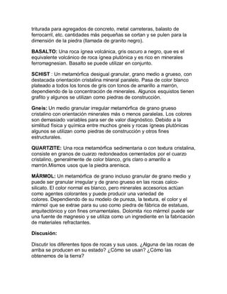 Las rocas se utilizan principalmente en la construcción e industrias como materiales de construcción, agregados para hormigón, piedra ornamental y para extraer minerales. El carbón se utiliza para producir electricidad, la caliza para fabricar cemento y cal, y la arcilla para hacer ladrillos y cerámica. Otras rocas como el granito, la arenisca y el mármol se utilizan comúnmente en la construcción de edificios y monumentos.