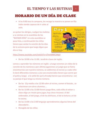El documento describe la rutina diaria de una clase. Por la mañana, los niños llegan al aula, cuelgan sus abrigos y asisten a la asamblea. Luego toman clases de inglés de 10 a 11, incluyendo canciones y juegos. De 11:30 a 12 comen el almuerzo y juegan en el recreo. En la tarde, de 12 a 1 tienen tiempo de juego libre en diferentes rincones del aula como ordenadores, disfraces o lectura. De 1 a 2 toman clases de lenguaje aprendiendo letras del