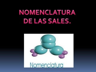 Este documento describe las sales químicas, que son compuestos formados por cationes enlazados a aniones. Las sales son típicamente el producto de una reacción entre un ácido y una base, y son compuestos iónicos que forman cristales solubles en agua. El documento también clasifica diferentes tipos de sales y proporciona ejemplos.