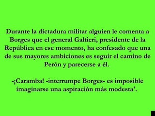 Este documento presenta varias anécdotas e intercambios ingeniosos de Jorge Luis Borges en diferentes momentos y contextos. Algunas de sus respuestas irónicas incluyen comentarios sobre la dictadura militar, la guerra de Malvinas, el peronismo, y ocasiones en que rechazó halagos o críticas con humor y sabiduría.