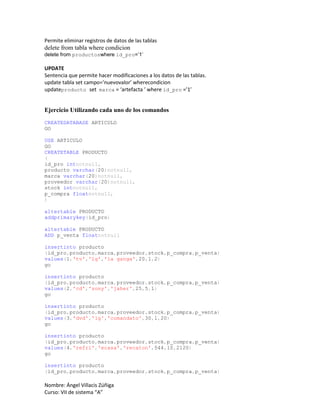 Este documento describe las principales categorías de sentencias SQL como DDL, DML y las operaciones básicas de cada una. DDL se utiliza para crear y definir bases de datos, tablas e índices mediante operaciones como CREATE, ALTER y DROP. DML permite consultas, inserciones, actualizaciones y eliminaciones de datos en las tablas usando sentencias como SELECT, INSERT, UPDATE y DELETE. Se incluye un ejemplo completo de uso de estas sentencias SQL.