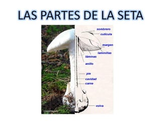 Este documento describe los hongos y setas. Explica que los hongos son organismos que descomponen materia orgánica y que producen enfermedades y alimentos como el pan y el vino. Las setas son el aparato reproductor de los hongos superiores que crecen bajo tierra. Hay varios tipos de setas comestibles y venenosas, y se reproducen mediante esporas. El documento también cubre la historia, clasificación y estructura de los hongos.