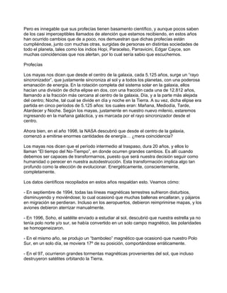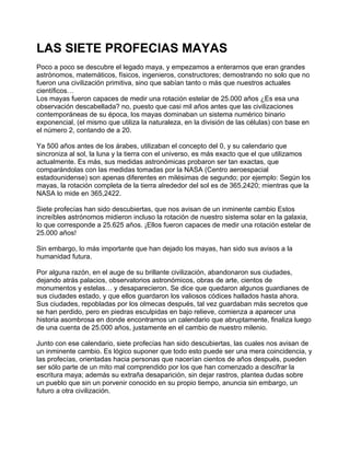 Los mayas fueron avanzados astrónomos y matemáticos que predijeron cambios futuros. Dejaron siete profecías que advierten de un cambio inminente, incluido el fin de un ciclo de 25,000 años en 2012. Sus mediciones astronómicas fueron extremadamente precisas. Sus profecías parecen estar cumpliéndose a través de cambios magnéticos y de frecuencia en la Tierra, lo que podría afectar negativamente a la humanidad a menos que evolucionemos.