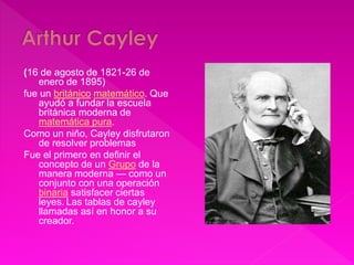 Arthur Cayley fue un matemático británico que ayudó a fundar la escuela británica moderna de matemática pura. Definió por primera vez el concepto moderno de un grupo como un conjunto con una operación binaria que satisface ciertas leyes. Las tablas de Cayley llevan su nombre en honor a su creación de este concepto fundamental.