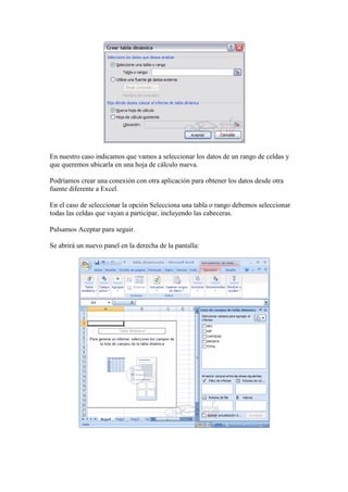 Una tabla dinámica permite resumir y analizar conjuntos de datos agrupándolos de diferentes formas y permitiendo filtrar y cambiar la presentación de los datos. Se puede crear una tabla dinámica en Excel seleccionando los datos y arrastrando los campos apropiados a las secciones de filas, columnas y valores. Esto permite crear tablas dinámicas personalizadas para analizar mejor los datos.