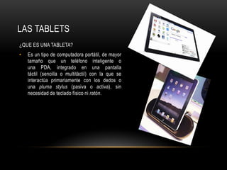 Este documento habla sobre las tabletas y las compara con computadores portátiles y teléfonos inteligentes. Explica que las tabletas ofrecen movilidad y son más livianas que los computadores portátiles. También menciona que Apple y Samsung se acusan mutuamente de violar patentes relacionadas con el diseño de iPads y tabletas.