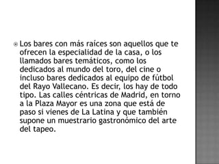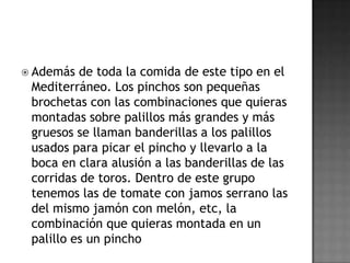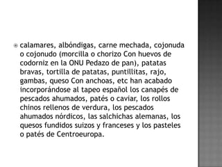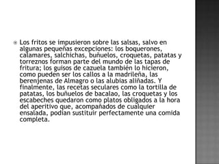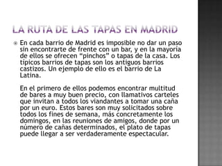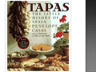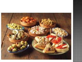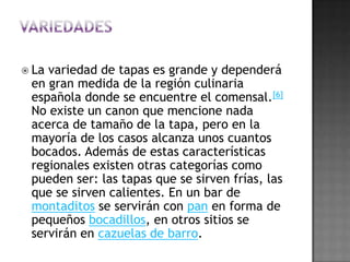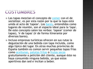 El documento describe el origen y la historia de las tapas en España. Explica que las tapas se remontan a la Edad Media y tenían la función de acompañar las bebidas alcohólicas y evitar sus efectos. También cubrían los vasos para impedir que entrasen insectos. Hoy en día, las tapas son un elemento cultural importante en España y varían según la región, pero suelen incluir ingredientes como jamón, queso, aceitunas y verduras fritas. Existen muchas leyendas sobre el origen de la palabra "tap