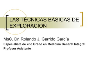 Este documento describe las técnicas básicas de exploración médica, incluyendo la inspección, palpación, percusión y auscultación. Explica cómo realizar correctamente cada procedimiento, prestando atención a detalles como la iluminación adecuada, la posición de los dedos, y los tipos de sonidos que pueden escucharse. El objetivo es enseñar a los estudiantes habilidades clínicas fundamentales para evaluar a pacientes de manera efectiva.