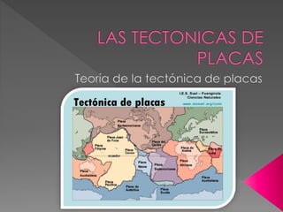 La litósfera está dividida en placas tectónicas que se mueven constantemente sobre la astenosfera debido al calor del interior de la Tierra. La teoría de la tectónica de placas explica cómo las placas interactúan entre sí a lo largo de sus bordes, pudiendo una placa deslizarse por debajo de otra en un proceso de subducción que genera terremotos y montañas.
