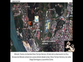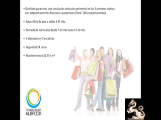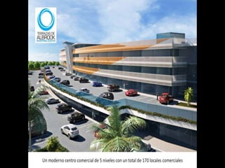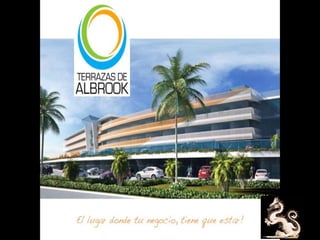 El documento presenta información sobre el centro comercial Las Terrazas de Albrook, gestionado por Bienes y Raíces Espino. Se proporciona un enlace a un blog relacionado donde se puede encontrar más detalles. Enfoca su contenido en aspectos comerciales y de propiedad del centro.