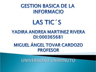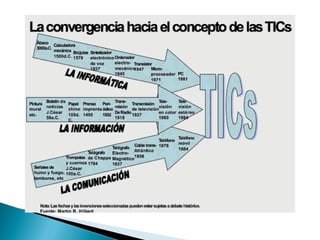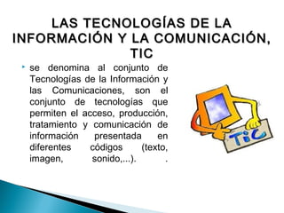 Las Tecnologías de la Información y la Comunicación (TIC) permiten el acceso, producción, tratamiento y comunicación de información en diferentes formatos como texto, imágenes y sonido. Las TIC tienen características como la inmaterialidad, interactividad e interconexión que facilitan la transmisión instantánea de información entre lugares distantes con alta calidad. Las TIC también tienen una gran influencia en los procesos de adquisición de conocimiento y se han extendido a todos los sectores de la sociedad.