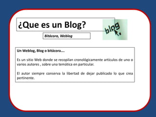 Este documento describe las características principales de un blog. Un blog es un sitio web donde se publican artículos de forma cronológica sobre un tema en particular. A diferencia de una página web estática, un blog es más dinámico y permite actualizaciones frecuentes. Los blogs también son más interactivos porque permiten comentarios de lectores. Los autores de blogs pueden publicar contenido de forma rápida y sencilla sin necesidad de conocimientos técnicos.