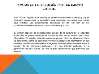 El documento argumenta que las TIC han cambiado radicalmente la educación al convertirse en uno de los pilares básicos de la sociedad. Propone que la educación debe incorporar el conocimiento y uso de las TIC de dos maneras: integrando la nueva cultura digital en todos los niveles educativos y asegurando que este conocimiento se traduzca en un uso generalizado de las TIC para facilitar el aprendizaje a lo largo de la vida.