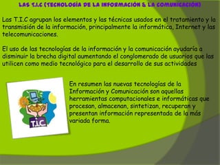 Las TIC agrupan elementos y técnicas para procesar, almacenar, sintetizar e intercambiar información, incluyendo computadoras, internet y telecomunicaciones. Su uso puede reducir la brecha digital al aumentar el número de usuarios que las emplean para actividades. Las TIC constituyen nuevos soportes como pizarras digitales, blogs y podcasts para crear, almacenar y difundir contenidos. También tienen un impacto en la opinión pública a través de mensajes en medios como televisión, celulares y comput