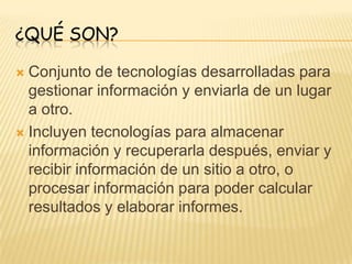 Este documento define las tecnologías de la información y la comunicación (TIC) como conjuntos de tecnologías para gestionar, almacenar, enviar e intercambiar información. Explica que las TIC sirven para recuperar, almacenar, organizar y manejar información para producir y presentar conocimiento. Luego describe características como la inmaterialidad, interactividad y penetración en todos los sectores. Finalmente, destaca que las TIC son importantes económicamente y para la sociedad al ampliar la difusión de mensajes a más personas