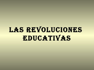 La primera revolución educativa supuso el nacimiento de la escuela con un método determinado basado en la Didáctica Magna de Comenio. La segunda revolución trajo los sistemas escolares con objetivos educativos como la alfabetización y objetivos políticos como la formación de una nación. La tercera revolución se caracterizó por el éxodo rural a las ciudades y el ingreso masivo a la educación. La cuarta revolución plantea el desafío de mejorar la calidad educativa a través del repensar el modelo de ense
