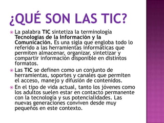 El documento define las Tecnologías de la Información y la Comunicación (TIC) como herramientas que permiten almacenar, organizar, sintetizar y compartir información en diferentes formatos. Explica la evolución de la Web de solo lectura (Web 1.0) a la Web interactiva (Web 2.0) donde los usuarios pueden interactuar y aportar contenido. También describe brevemente el origen y propósito de las redes sociales como sitios para conectar a personas con intereses similares y compartir contenidos.