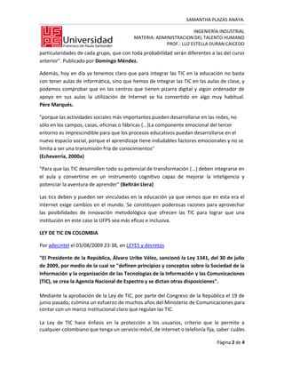 Las Tecnologías de la Información y Comunicación (TIC) son importantes para la vida humana y pueden vincularse en ámbitos como la educación y el trabajo. Varias leyes en Colombia, como la Ley de TIC de 2009 y el Plan Nacional de TIC 2008-2019, tienen como objetivo promover el uso de las TIC para mejorar la inclusión social y la competitividad del país. Los autores discuten cómo las TIC pueden integrarse en las aulas para apoyar un aprendizaje colaborativo y adaptado a las necesidades de los estudiantes.