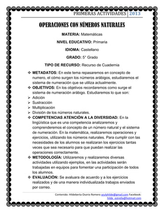 Estos tres documentos presentan temas de matemáticas para estudiantes de 5° y 6° grado. El primer documento trata sobre los números a lo largo de las civilizaciones y sus representaciones. El segundo cubre operaciones con números naturales como suma, resta, multiplicación y división. El tercer documento habla sobre la medición del tiempo y las unidades como horas, minutos y segundos. Los objetivos, competencias, metodología y evaluación se describen para cada tema.