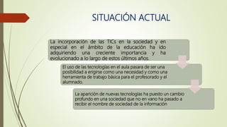 El documento resume la importancia de la educación basada en las TIC. Explica que las TIC se han vuelto cada vez más importantes en la sociedad y la educación. Su uso ha pasado de ser una opción a ser una necesidad y herramienta básica. También destaca que las TIC apoyan la economía del conocimiento y que su uso en la educación mejora el aprendizaje de los estudiantes y les da habilidades para la vida. Sin embargo, también tiene algunas desventajas como distracciones y aprendizaje superficial.