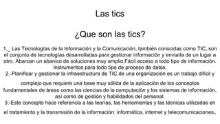 Las TIC son tecnologías que sirven para ayudar a empresas, educación y el hogar mediante el procesamiento y transmisión de información. En el hogar permiten la comunicación y acceso a información, y los padres deben desarrollar habilidades digitales para acompañar a sus hijos. En la educación facilitan el aprendizaje y enseñan habilidades tecnológicas. Finalmente, en el ámbito laboral agilizan procesos productivos y simplifican tareas.