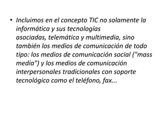 Las Tecnologías de la Información y Comunicación (TIC) incluyen no solo la informática y tecnologías asociadas, sino también los medios de comunicación masiva y los medios interpersonales con soporte tecnológico. Las TIC son parte integral de la cultura tecnológica actual y amplían nuestras capacidades físicas y mentales, además de ofrecer mayores posibilidades de desarrollo social. La sociedad de la información impulsada por avances científicos en un marco de globalización neoliberal,
