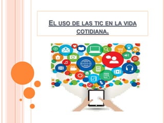 El documento describe cómo las TIC (tecnologías de la información y comunicación) como el internet, los teléfonos móviles y el correo electrónico ahora forman parte integral de la vida cotidiana al simplificar las tareas diarias y transformar la forma en que accedemos y compartimos información. Las TIC también tienen un gran impacto en la educación al facilitar el aprendizaje y la coordinación, y en el lugar de trabajo al agilizar la comunicación y la productividad entre los empleados y clientes.