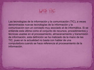 Las tecnologías de la información y la comunicación (TIC) incluyen recursos como ordenadores, programas informáticos y redes que permiten manipular, almacenar, administrar, transmitir y encontrar información. Las TIC se pueden clasificar según redes, terminales y servicios y ofrecen oportunidades educativas al proporcionar conocimientos sobre cómo se genera, almacena y transmite información en la sociedad actual.