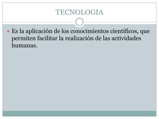El documento describe cómo las tecnologías de la información y la comunicación (TIC) han permitido el desarrollo humano al protagonizar innovaciones masivas en la sociedad en áreas económicas, culturales y otras, llevándonos a una era digital y a adoptar posiciones innovadoras al usar las TIC. Define la tecnología como la aplicación de conocimientos científicos para facilitar actividades humanas, la información como datos con significado para grupos, y la comunicación como la transmisión de mensajes entre personas para expresar sentimientos, pensam