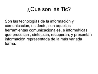 Este documento presenta una introducción a las tecnologías de la información y la comunicación (TIC), destacando que son herramientas que procesan, sintetizan y presentan información de diversas formas. Explica que las TIC tienen la ventaja de ayudar a los estudiantes a aprender a investigar y usarlas como herramientas, así como los libros, si se aplican con una buena estrategia y metodología. También señala algunas limitaciones de las TIC en la sociedad, como distracciones que hacen que los estudiant