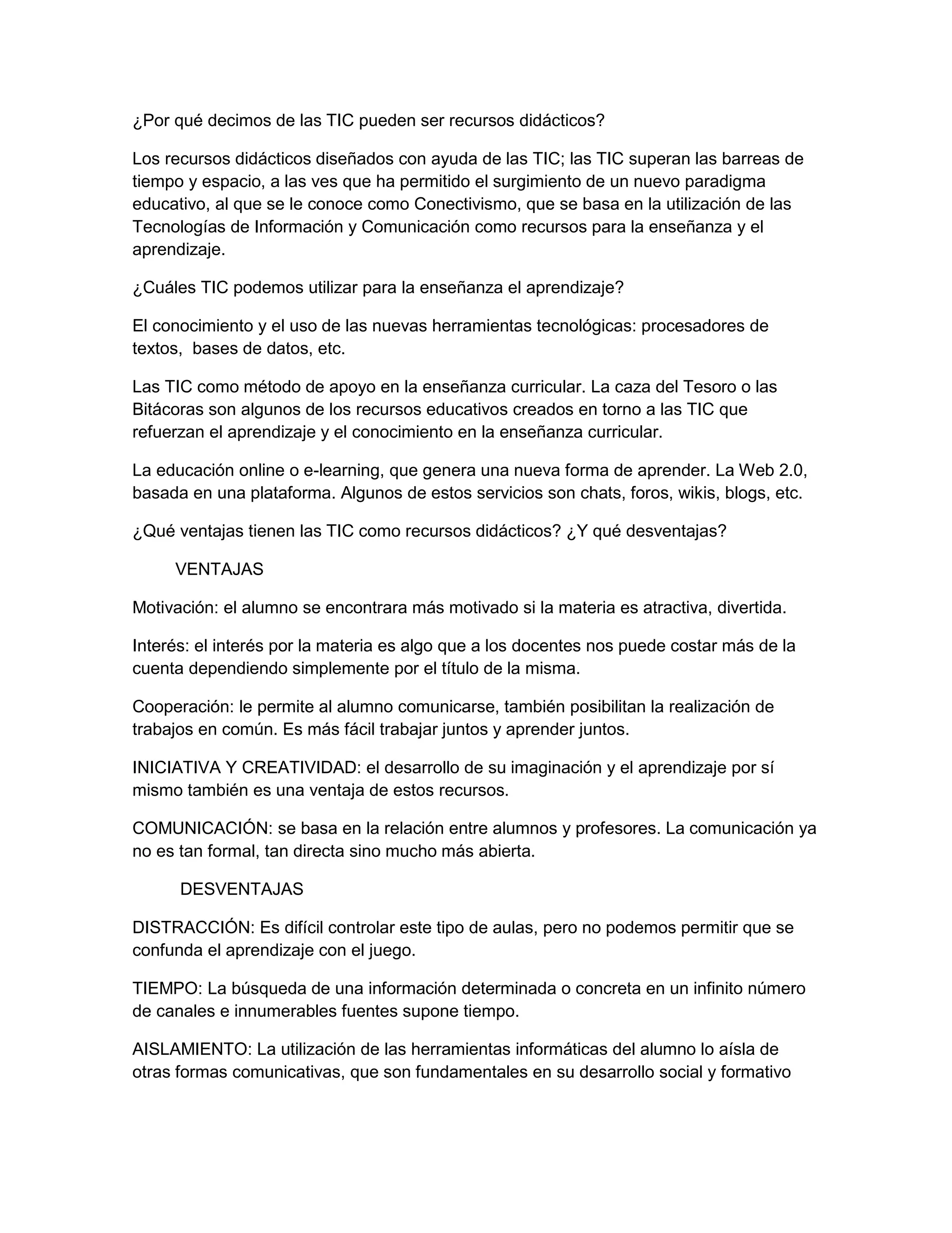 El documento discute las ventajas y desventajas de usar tecnologías de la información y la comunicación (TIC) como recursos didácticos. Las TIC superan las barreras de tiempo y espacio y permiten un nuevo paradigma educativo llamado conectivismo. Entre las ventajas se encuentran la motivación de los estudiantes, el interés en las materias, la cooperación y la comunicación. Las desventajas incluyen la distracción, la pérdida de tiempo buscando información y el aislamiento de otros tipos de comunicación importantes para el