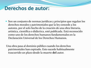 El documento habla sobre los conceptos legales y éticos del uso de la información digital. Explica que los derechos de autor protegen las obras creadas y que una obra pasa al dominio público después de un tiempo de la muerte del autor. También discute las dimensiones morales relacionadas con los sistemas de información como los derechos y obligaciones de información y los derechos de propiedad. Finalmente, cubre aspectos legales como la protección de programas informáticos bajo los derechos de autor y que la copia no autorizada de software es ilegal