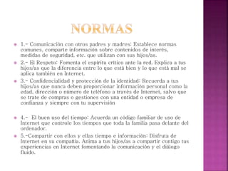 El documento ofrece 10 recomendaciones para que los padres guíen el uso seguro y positivo de Internet por parte de sus hijos. Estas incluyen establecer normas comunes con otros padres, fomentar el respeto, proteger la privacidad, controlar el tiempo frente a pantallas y compartir experiencias online para fortalecer la comunicación familiar.