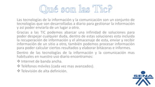 El documento describe las tecnologías de la información y la comunicación (TIC) y su impacto. Explica que las TIC permiten gestionar y compartir información de forma digital a través de dispositivos como Internet de banda ancha, teléfonos móviles y televisión. También han transformado el desarrollo laboral de las empresas y la manera de hacer negocios. Las TIC incluyen redes, terminales y servicios que facilitan el acceso a la información de manera inmaterial, instantánea e interactiva.