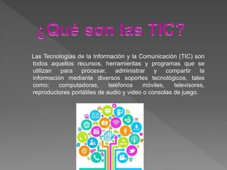 Las Tecnologías de la Información y la Comunicación (TIC) se refieren a las herramientas tecnológicas como computadoras, teléfonos, televisores y consolas que se usan para procesar, administrar y compartir información. Las TIC ahora juegan un papel importante en la vida cotidiana al permitir que las personas se comuniquen y accedan a información de forma rápida e instantánea. Las TIC también se han integrado ampliamente en la educación y los negocios, donde facilitan la enseñanza, el