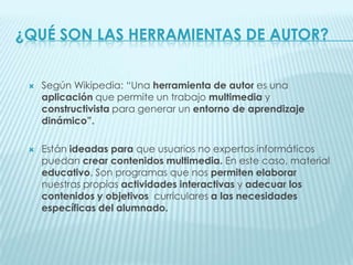 Las herramientas de autor permiten a usuarios no expertos crear contenidos educativos multimedia e interactivos para adaptar los materiales a las necesidades de los estudiantes. Un ejemplo es el sistema LIM, que permite crear lecciones en formato web accesibles desde cualquier dispositivo sin necesidad de instalación, y que ofrece ventajas como la retroalimentación automática y el control del progreso de los estudiantes. Otras herramientas populares incluyen Ardora, Constructor y Hot Potatoes.
