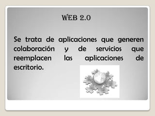 Este documento presenta definiciones breves de varios términos relacionados con las TIC's. Explica que la Web 2.0 se refiere a aplicaciones que generan colaboración y servicios que reemplazan aplicaciones de escritorio, mientras que la Web 3.0 implica la transformación de la red en una base de datos. También define términos como blog, wiki, internet, YouTube, issuu y redes sociales.