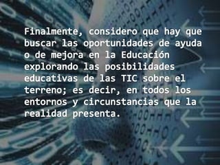 El documento argumenta que es necesario diseñar y probar modelos de formación docente con el uso de las tecnologías de la información y la comunicación (TIC) que sean viables a las condiciones de disponibilidad, acceso y uso actuales, y que respondan a las condiciones socioculturales. Asimismo, señala que las TIC deben usarse para organizar y desarrollar procesos de aprendizaje socioconstructivistas, y que herramientas como Internet permiten ampliar el acceso a la educación superior y el conocimiento.