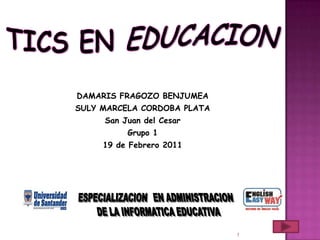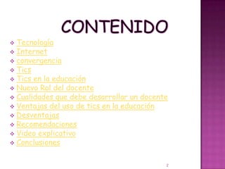 Este documento discute el uso de las tecnologías de la información y la comunicación (TIC) en la educación. Brevemente describe las TIC, sus ventajas como facilitar el aprendizaje y permitir el acceso a más información, y sus desventajas como la distracción. También recomienda integrar las TIC en el plan de estudios y comprender su aplicación didáctica.