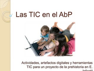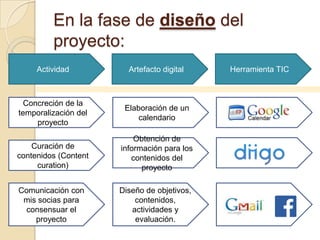 El documento describe las actividades, herramientas digitales y TIC que se utilizarán en las diferentes fases de un proyecto sobre la prehistoria en educación primaria. En la fase de diseño se utilizará un calendario y comunicación en línea para planificar el proyecto. En la fase de desarrollo se usarán videos y presentaciones para presentar contenidos a los estudiantes. En la fase de difusión se creará una presentación y dossier final para compartir los resultados del proyecto en línea y con el equipo docente. Las socias han acordado
