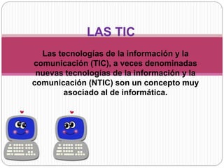 Este documento describe las tecnologías de la información y la comunicación (TIC) y su uso en la educación. Explica que las TIC promueven la educación, la capacitación profesional y la formación continua a través del intercambio de experiencias y proyectos relacionados con la sociedad de la información. También detalla cómo las TIC pueden usarse en el aula para proporcionar recursos pedagógicos nuevos y motivadores, lograr una participación activa de los estudiantes y optimizar el aprendizaje.