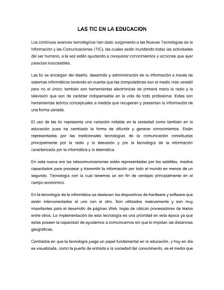 Las TIC (Tecnologías de la Información y Comunicación) han cambiado la forma en que se difunde y genera conocimiento en la educación. Si bien las computadoras y la tecnología digital proveen gran cantidad de información de forma accesible, es importante que los docentes integren las TIC de manera estratégica considerando las características de los estudiantes, el contexto y los objetivos educativos, y no dependan únicamente de la tecnología. El rol del docente también ha evolucionado para facilitar el aprendizaje de los estudiantes a
