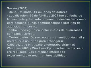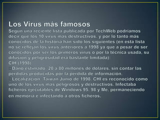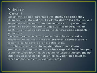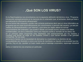 El documento define qué son los virus informáticos y describe varios tipos de virus. Los virus son programas maliciosos que se replican a sí mismos y se propagan sin el conocimiento o permiso del usuario. El documento explica virus como residentes, de acción directa, de sobreescritura, de arranque, retrovirus, multipartitos, de macro, de enlace, polimórficos, gusanos y troyanos.