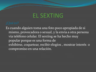 El documento habla sobre el sexting, que es cuando alguien toma una foto sexual de sí mismo y la envía a otra persona por teléfono celular. Explica que aunque para algunos no parece importante, compartir estas fotos conlleva riesgos como que la imagen se comparta más allá de lo deseado y pueda terminar en manos de personas no deseadas o agresores. También menciona que es ilegal tener imágenes sexuales de menores de 18 años y que el sexting puede usarse para acosar y ganar la confianza de niños y jó