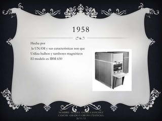 El documento resume los principales momentos del desarrollo de la computación en México desde 1958 hasta 2003, incluyendo la creación de las primeras computadoras en la UNAM y el IMSS usando tecnología de bulbos y tambores magnéticos, la llegada de las primeras microcomputadoras personales en la década de 1970, y la instalación de una supercomputadora en la UNAM en 2003 capaz de realizar 72 millones de operaciones por segundo.